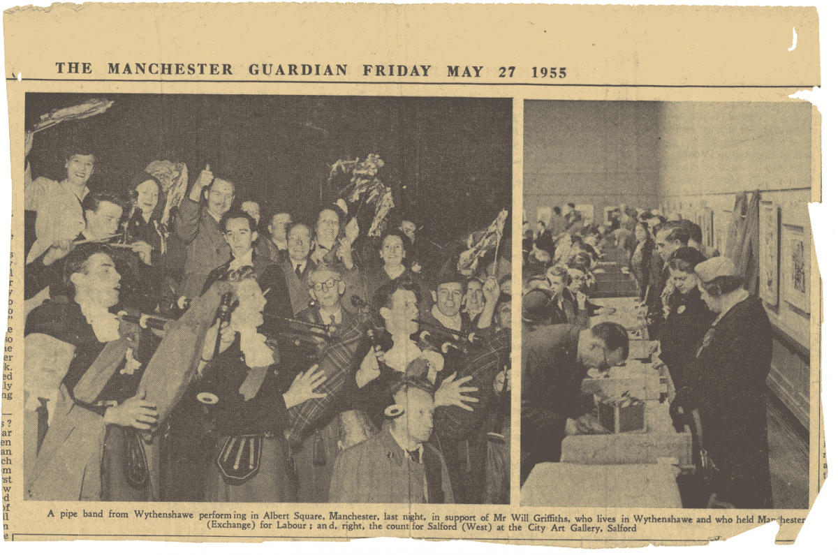 Jimmy Hickey and Bernard Mason playing for Will Griffiths after his re-election to Parliament in 1955 Many thanks to Betty and Pat O'Hara for the article.Above and right, members of the Band playing at the celebrations in Albert Square, Manchester following Will Griffiths' re-election as Member of Parliament for Manchester Exchange in 1955.