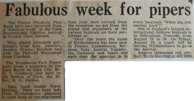 | The Fianna Phadraig Pipe Band returns from a fabulous week at the Cobh International Folklore Festival in County Cork, Ireland |
