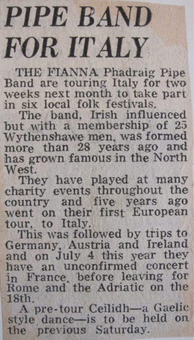 | The Fianna Phadraig Pipe Band tour Italy for two weeks to take part in six local folk festivals. |