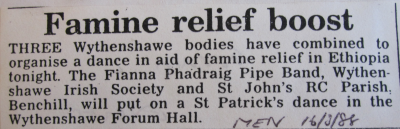 | The Band organises at St. Patrick's dance with the Irish Society and St. John's Parish at the Wythenshawe Forum hall in aid of famine relief in Ethiopia |