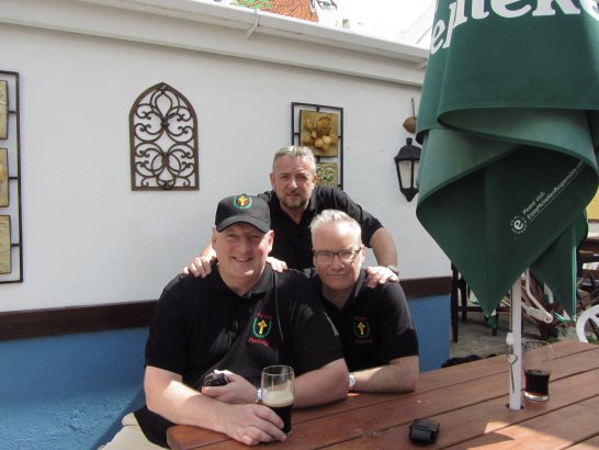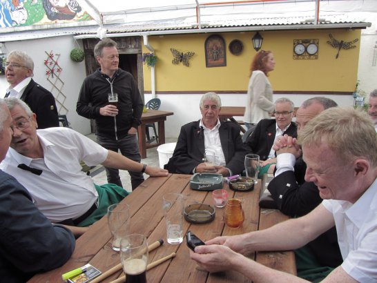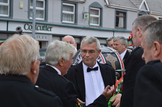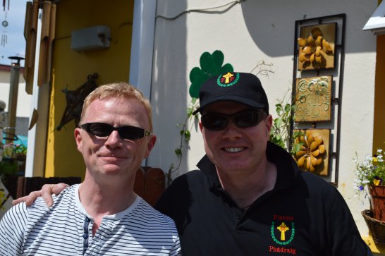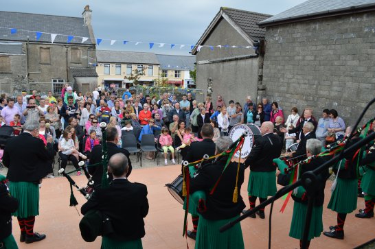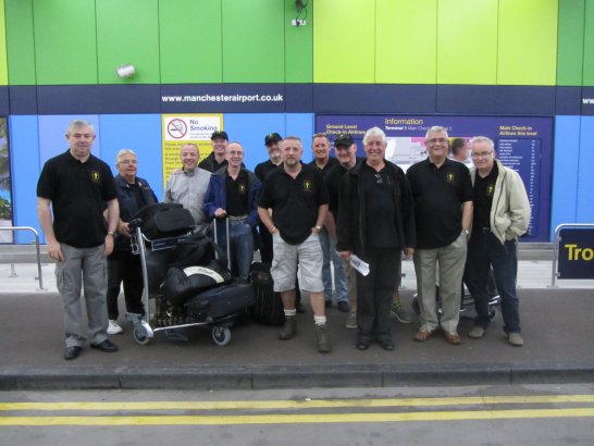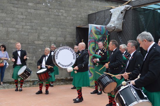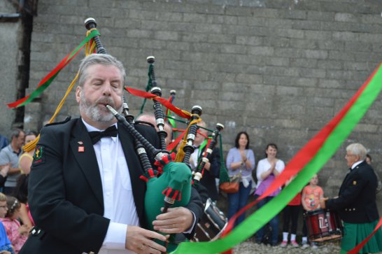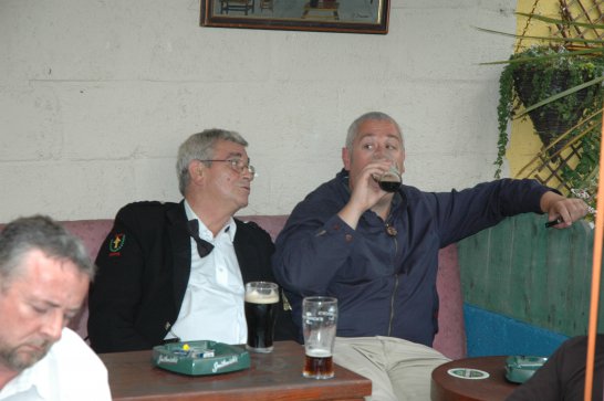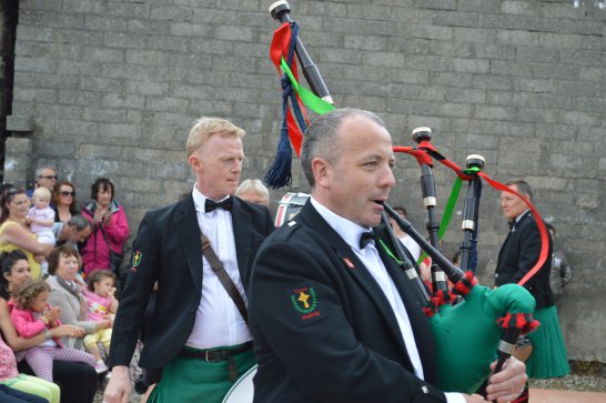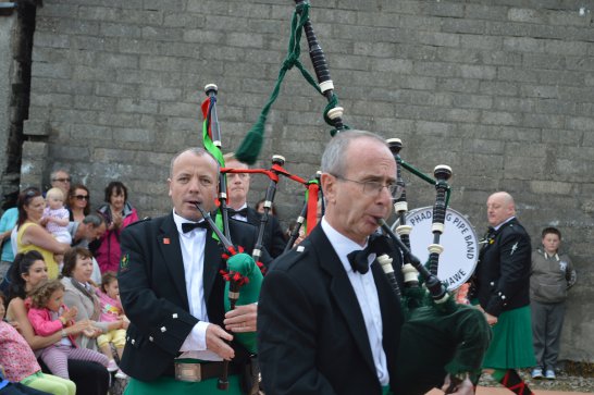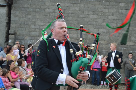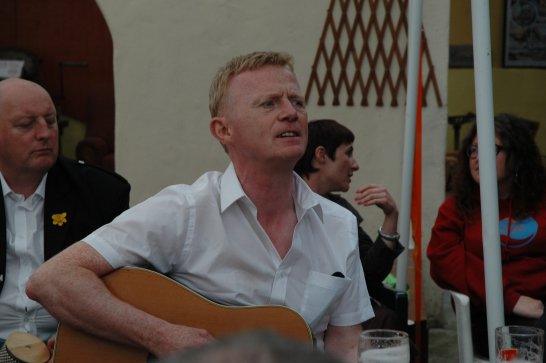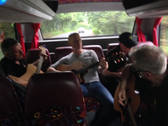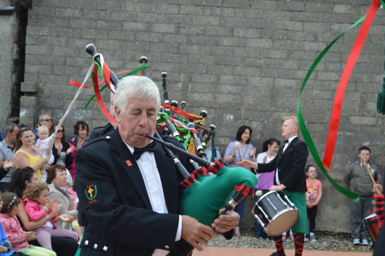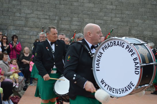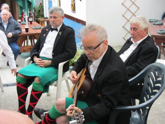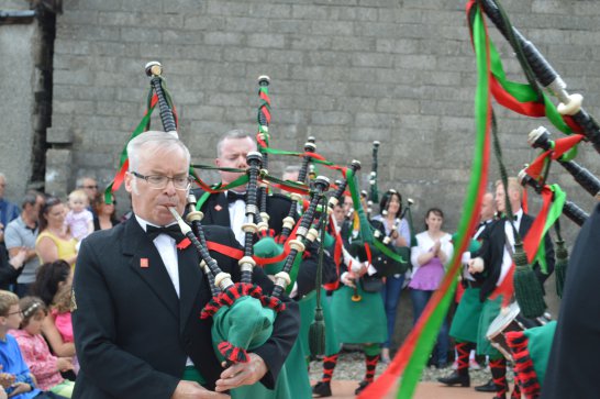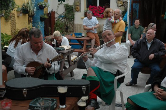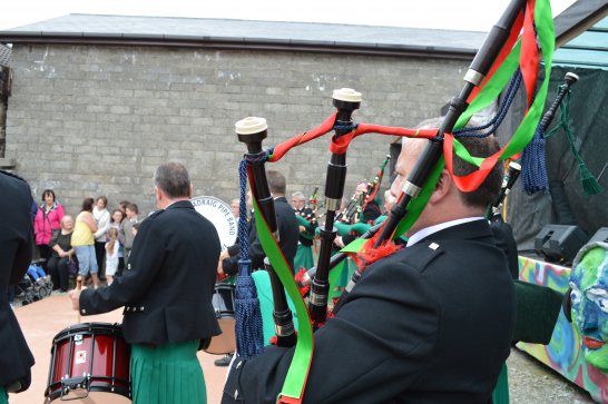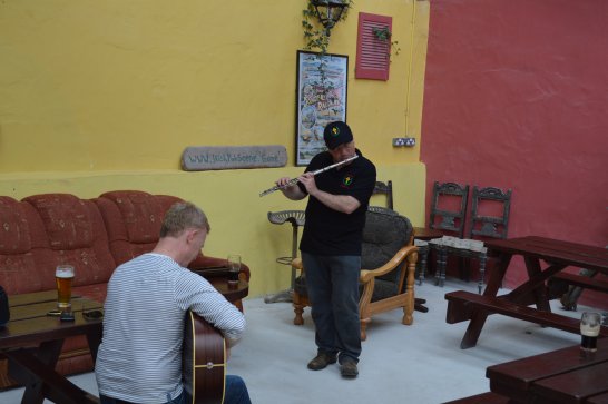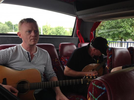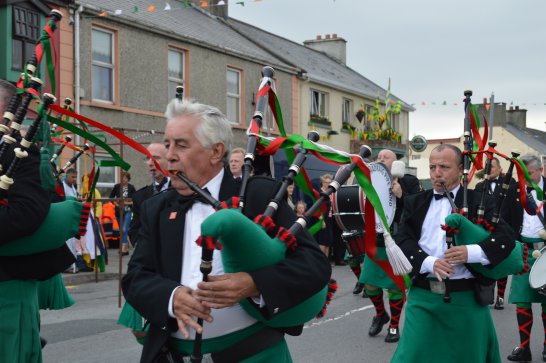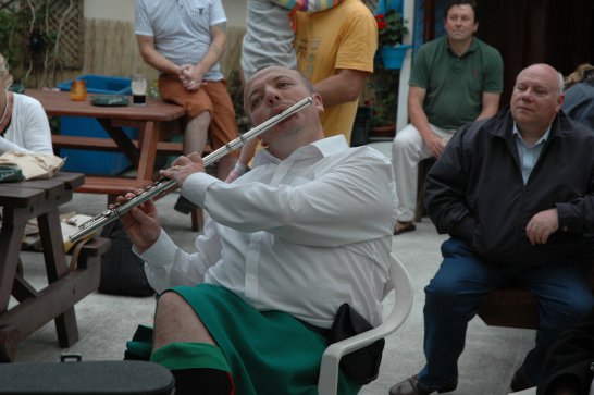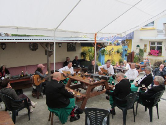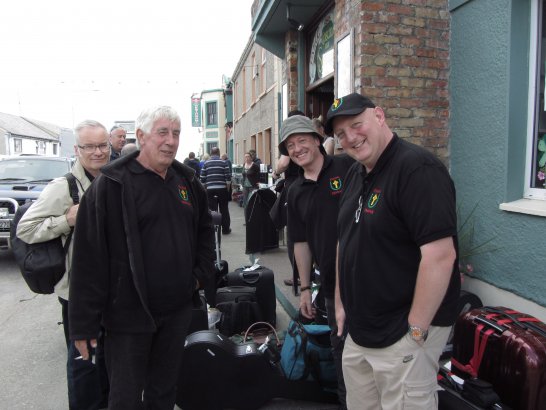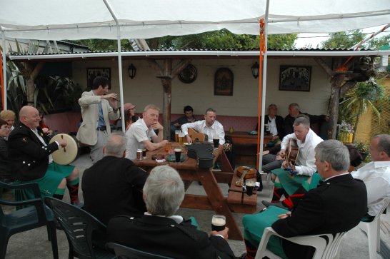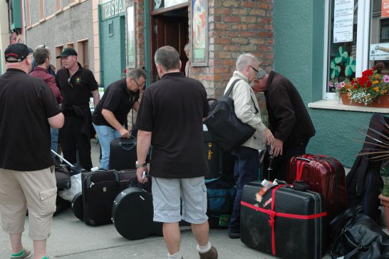 After a surprisingly smooth trip - everyone arrived at the airport on time (more or less!), all the bags (including pipes, drums, guitars and miscellaneous instruments) were checked in without a hitch (thank you, Mr. Cummins!), we took off from Manchester just 30 mins late for a short, 40-minute flight to Belfast International. br> br>Brendan and Paul were there to meet us, as was our coach driver, Brendan (another one!). The two-and-a-half hour drive was put to good use (40 winks, fine tuning for Lorica before their show this afternoon), before we reached Falcarragh and a fantastic welcome from Barry's family at the Shamrock (yes, all roads for the Band seem to lead to a pub called the Shamrock, whether it's in Ancoats or in County Donegal!), who greeted us with kind words and a lovely Irish smile. br> br>At 2 pm, we opened the Festival, marching a short distance along the high street to the Festifal stage, where we performed a 30-minute set to an appreciative and enthusiastic audience. br> br>The afternoon went on with an impromptu session at the Shamrock by Lorica (Barry, Brendan, Mike, Carl, John Fitz and Colin), who were soon joined by Tara, Andrew and Stephen, three fantastic local musicians. |