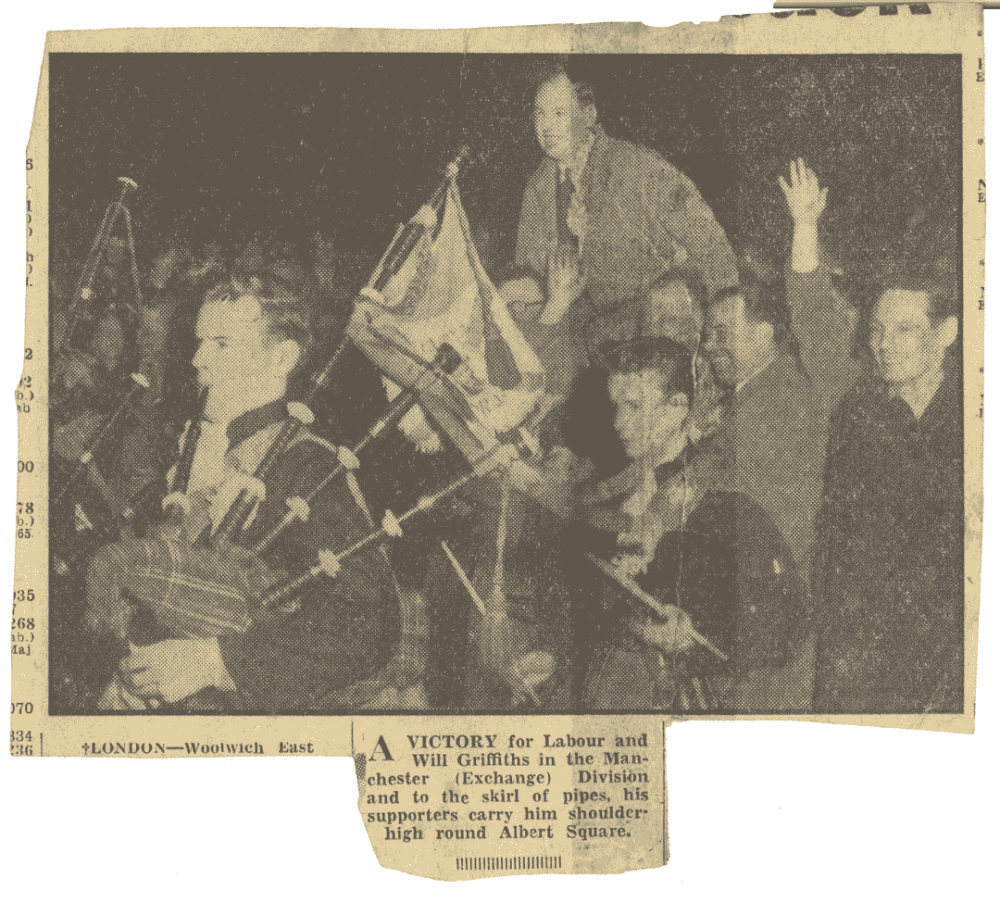 Jimmy Hickey and Bernard Mason playing for Will Griffiths after his re-election to Parliament in 1955 Many thanks to Betty and Pat O'Hara for the article.Above and right, members of the Band playing at the celebrations in Albert Square, Manchester following Will Griffiths' re-election as Member of Parliament for Manchester Exchange in 1955.