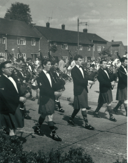 The Band marching down Dunkery Road in the fifties, with Brian Lee, Jimmy Hickey, Mike Rafferty and Mike Barker on the front row. From the Fianna Phádraig Pipe Band photo collection