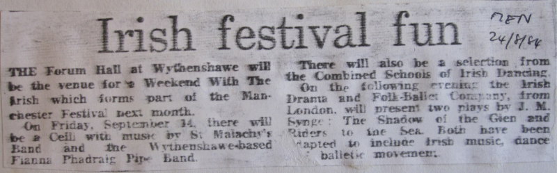 The Fianna Phádraig Pipe Band has been a familiar sight over the years at processions, garden parties and celebrations of all kinds, both locally in Wythenshawe and throughout the Great Manchester area and beyond.