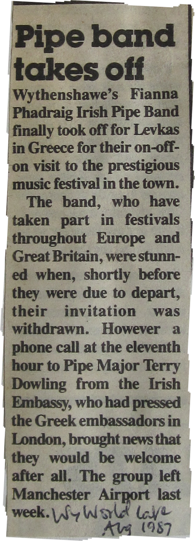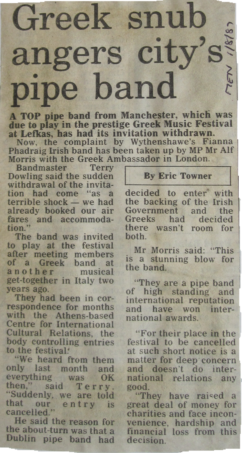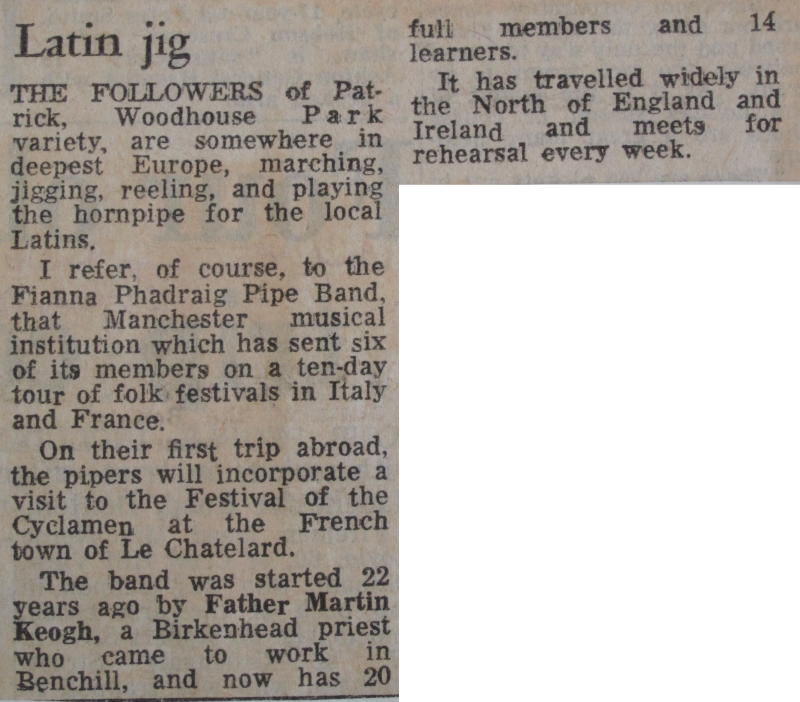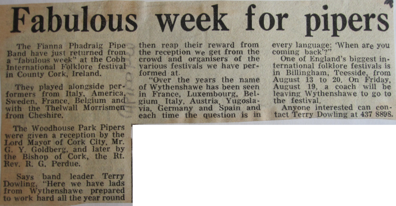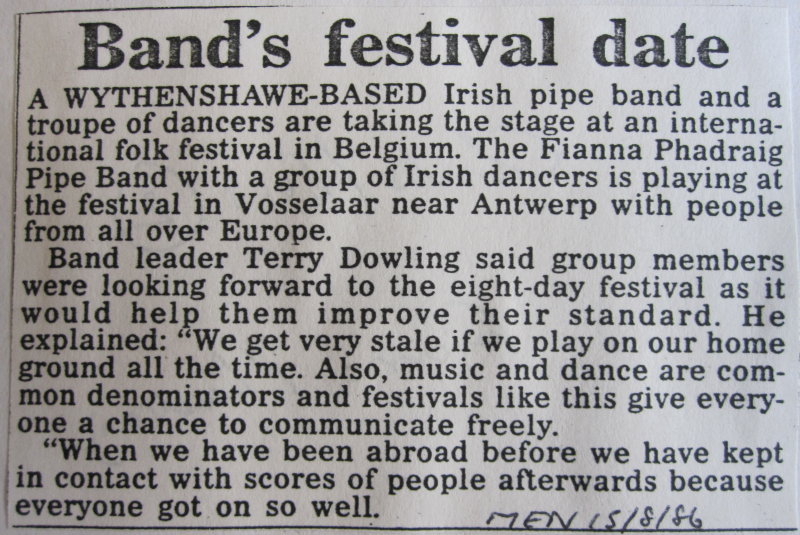 In 1969, Terry Dowling was contacted by Phil Conroy, a head teacher from Sunderland who was also one of the founders of the Billingham International Folklore Festival and General Secretary of the International Council of Organizations of Folklore Festivals and Folk Arts (C.I.O.F.F.), a non-governmental organization of UNESCO. Mr. Conroy was looking for an Irish pipe band to partner his own Irish dancing troupe, St. Leonard's Irish Dancers from Sunderland, during a tour of festivals in Tarcento, Italy and Challes-les-Eaux, in Savoie, France.