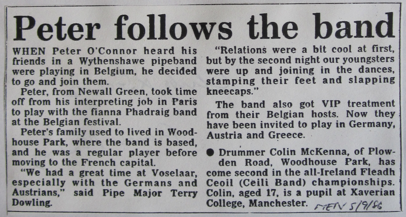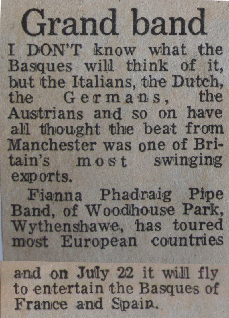 "From all appearances, the night events of the Festival proved also very successful. I recall walking along the beach from C.Y.M.S. Hall after the Artane Boys Band Concert on the Wednesday night, only to find that a number of the Pubs had closed their doors because they had full houses. Later on, I found myself upstairs in the Commodore Hotel, in what at first sight appeared to be a very rough and ready bar, but within minutes of arriving I had struck up several conversations with members of the visiting groups. The roll of drums, however, abruptly put an end to the conversations as the Manchester Fianna Phádraig Pipe Band marched into the hall. Now normally I would take exception to the proximity of a pipe band in the open air and I certainly did not want it in an enclosed space. That was until I became fully aware that it was probably, no definitely, the finest pipe playing it had ever been my pleasure to hear.