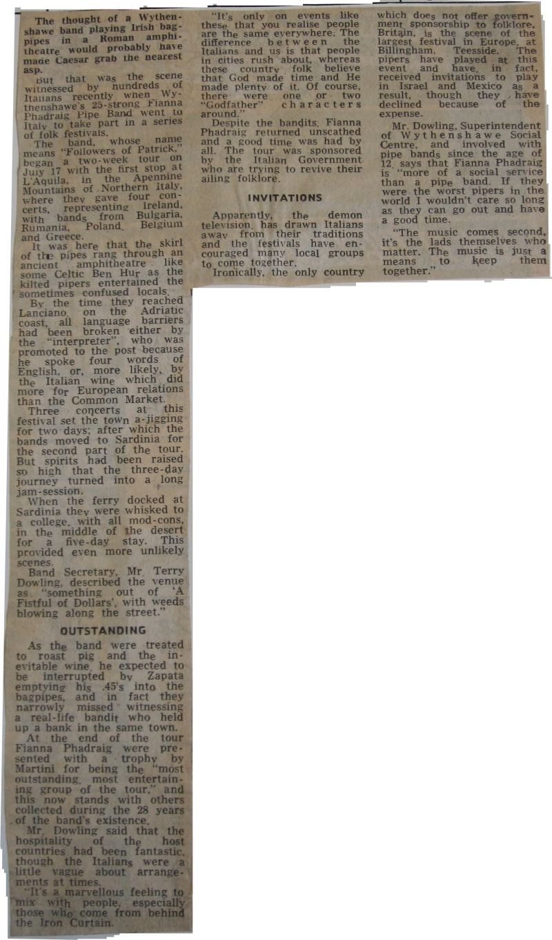 "Here in Italy were groups from the Congo, Germany, Hungary, America, France and Italy itself", said Terry Dowling, who is leader of the Pipe Band, as well as manager of the Wythenshawe Social Centre, Brownley Road. "The friendly atmosphere was terrific, and despite the language barriers many names and addresses were exchanged."