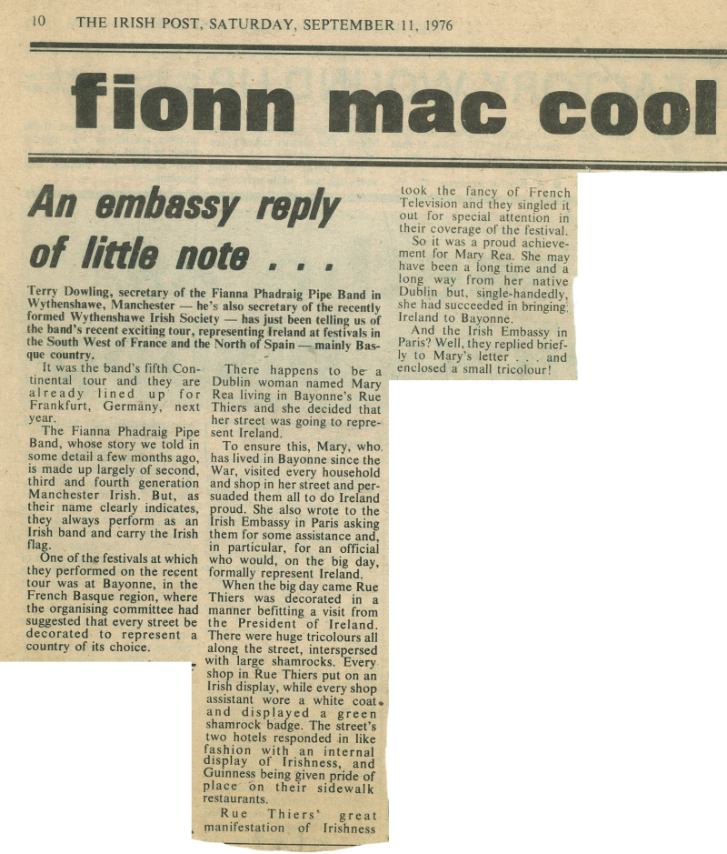 The atmosphere in Bayonne was, once again, unforgettable, largely thanks to the efforts of a lady from Dublin. But we'll leave it to the article published in the Irish Post on 11th September, 1976 to tell the full story: