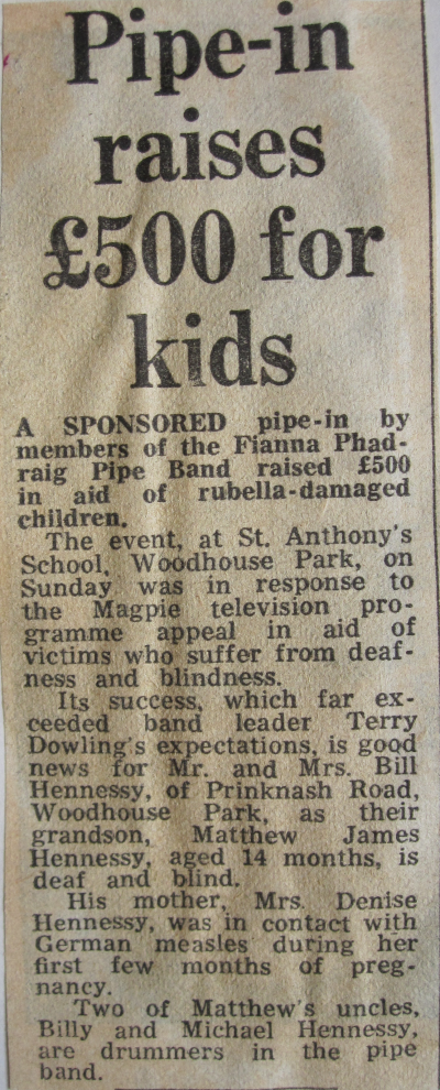 | The Band responds to the Magpie television programme appeal in aid of rubella-damaged children suffering from deafness and blindness |