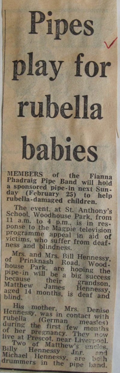 | Members of the Fianna Phadraig Pipe Band hold a sponsored pipe-in to help rubella-damaged children |