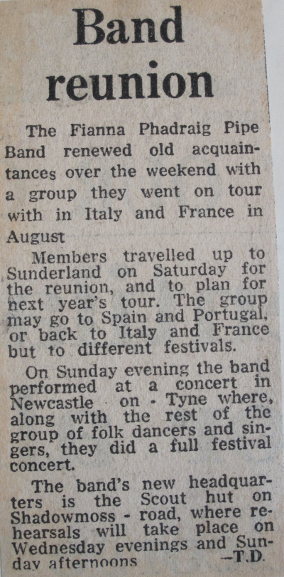 | Fianna Phadraig Pipe Band renews old acquaintances and moves to scout hut on Shadowmoss Road |